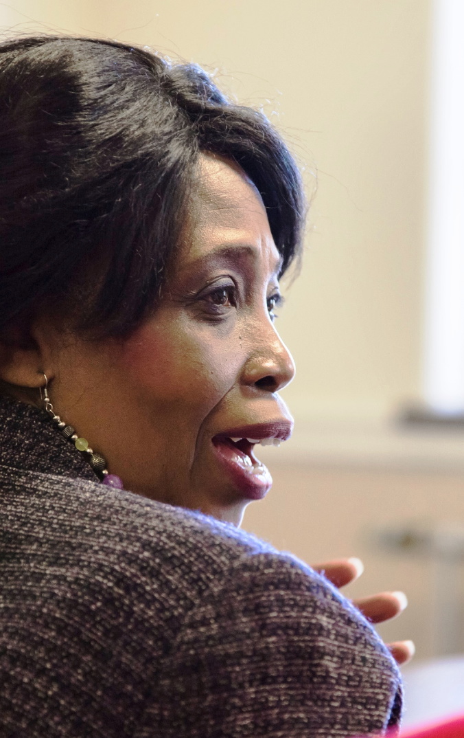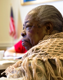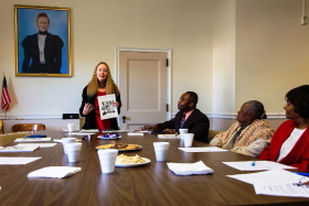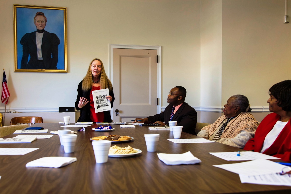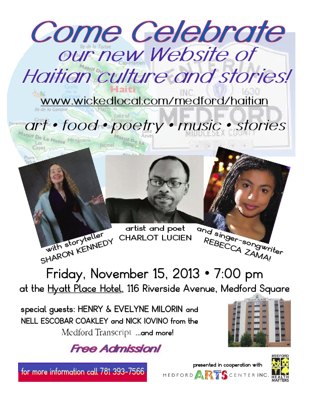 Medford storyteller Sharon Kennedy explains her oral history project to members of the Haitian community who gathered at City Hall on Nov. 5, 2012.