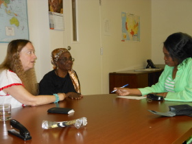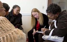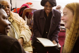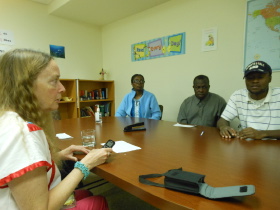 Elysee Castor speaks with Nathalie Fanfan, one of several Haitian immigrants who has volunteered to be interviewed by storyteller Sharon Kennedy, while fellow translator Josiane Bistoury listens.   PHOTO BY SYLVIA STAGG-GIULIANO
