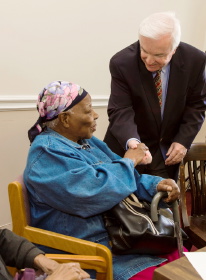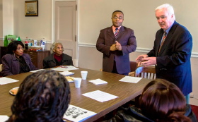 Mayor Michael J. McGlynn speaks with members of the Haitian community who attended the kick off of the ‘Haitian Culture and Stories’ project on Nov. 5, including Kettly Tucker, far left, and Dorothy Elizabeth Tucker, while Elysee Castor translates.